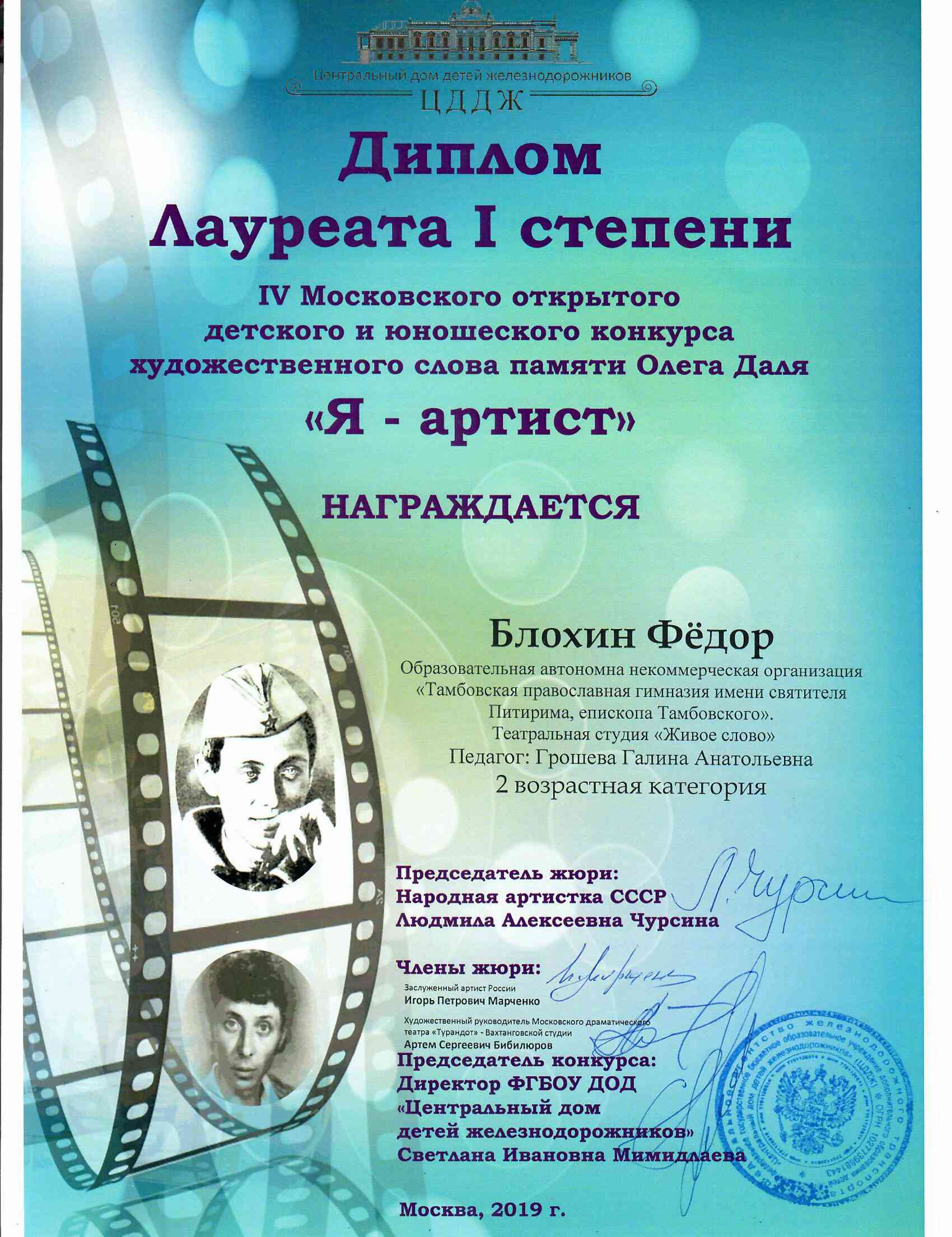 Поздравляем Блохина Федора, ученика 6 класса Православной гимназии с победой в IV Московском открытом детском и юношеском конкурсе художественного слова памяти Олега Даля в своей возрастной категории, а также с получением специального приза "За яркое участие в номинации "Герой нашего времени".