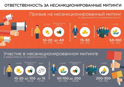 Право на участие граждан в санкционированных публичных мероприятиях (митингах, пикетах, шествиях) является правом каждого, но в участие в несанкционированных - является административным правонарушением, предусмотренным ст. 20.2 КоАП РФ и предусматривает наказание, в том числе в виде штрафа от 10 до 20 тысяч рублей, или обязательные работы на срок до ста часов, или административного ареста сроком до 15 суток.