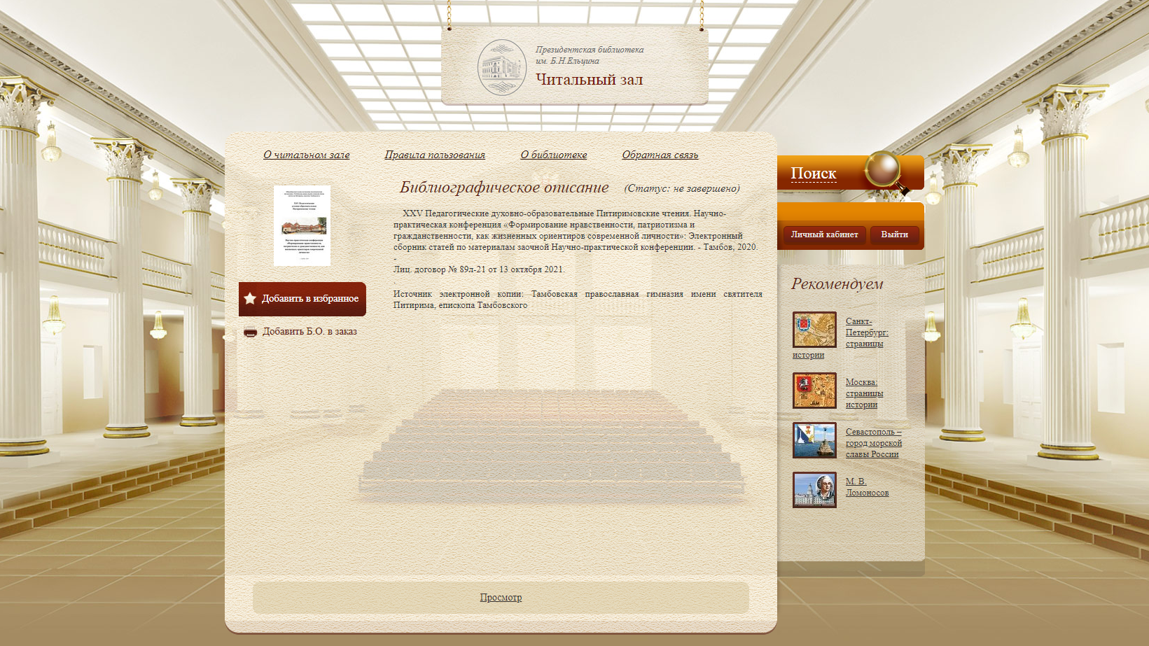 13 октября 2021 года между Тамбовской православной гимназией и Президентской библиотекой Б.Н. Ельцина был заключен договор о размещении в электронных ресурсах «Читального зала» Сборника статей по материалам заочной Научно-практической конференции «Формирование нравственности, патриотизма и гражданственности, как жизненных ориентиров современной личности», которая состоялась в рамках XXV Педагогических духовно-образовательных Питиримовских чтений.
