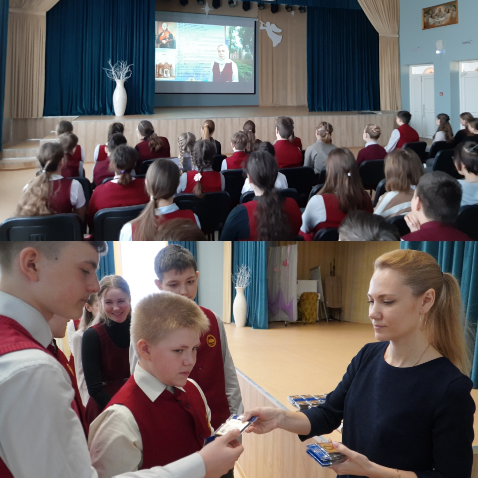 Гимназисты рассказали о ходе и местах съемок, о своих ролях, новых людях, с которыми познакомились, собирая информацию для фильма. На память о встрече все гимназисты получили иконки с изображением праведного воина Феодора Ушакова.