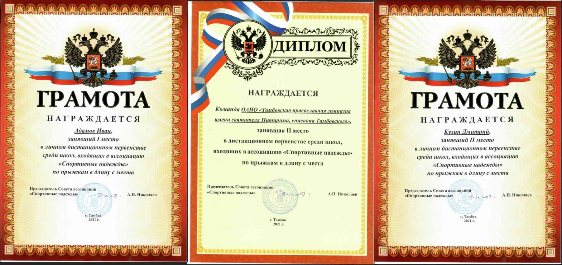 Поздравляем команду ОАНО "Тамбовская православная гимназия имени святителя Питирима, епископа Тамбовского", занявшую 2 место в дистанционном первенстве среди школ, входящих в ассоциацию "Спортивные надежды" по прыжкам в длину с места., победителя в личном зачете Адамова Ивана и призера (2 место) в личном зачете Кузина Дмитрия.