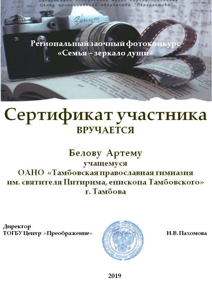 Учащиеся 4а класса Православной гимназии, под руководством Разумовой Маргариты Александровны, приняли участие в региональном заочном фотоконкурсе «Семья-зеркало души». Сертификаты участников вручены Шутовой Анне, Зерновой Анастасии, Белову Артему.