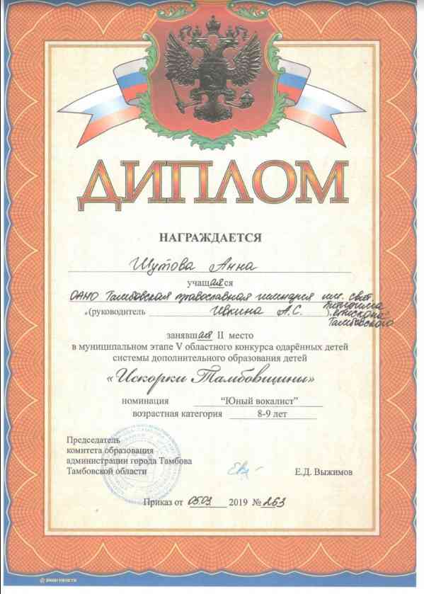 Поздравляем Шутову Анну, ученицу 3А класса, занявшую II место в муниципальном этапе V областного конкурса одаренных детей системы дополнительного образования детей «Искорки Тамбовщины» в номинации «Юный вокалист» (возрастная категория 8-9 лет).