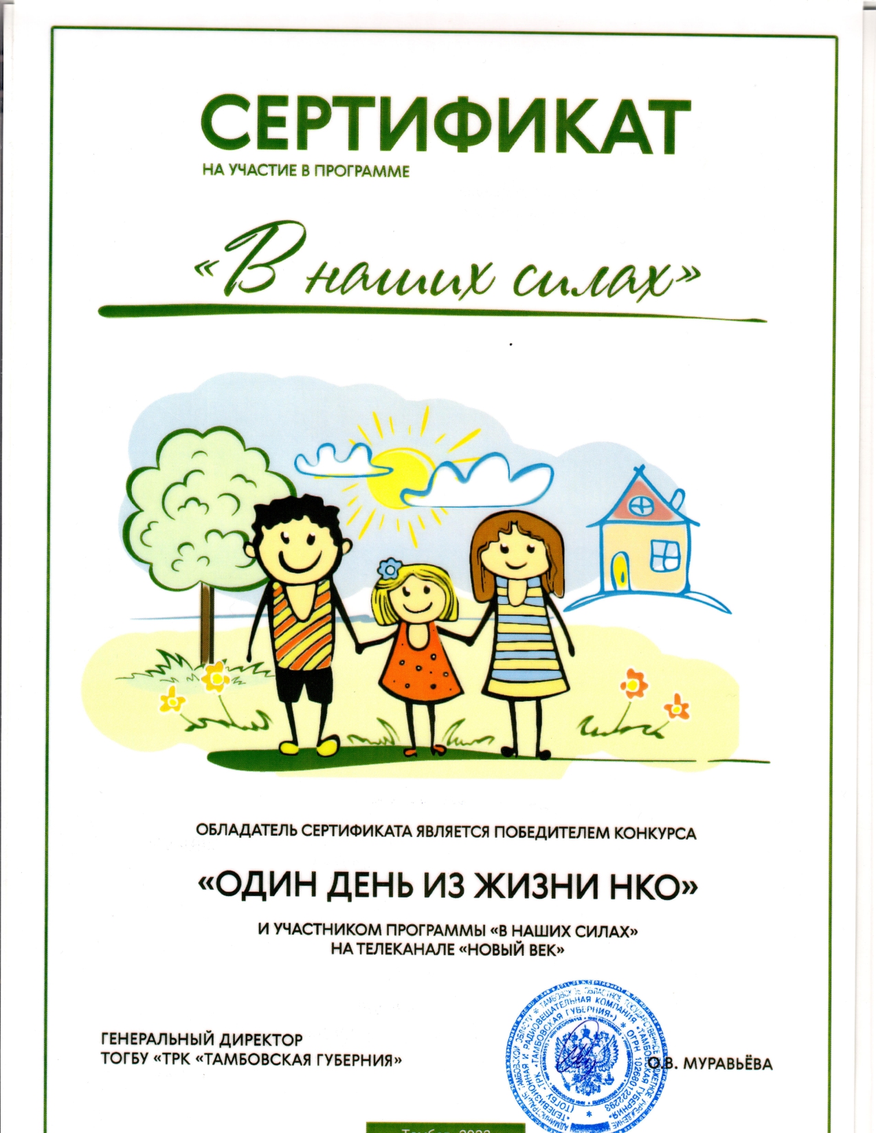 По итогам конкурса среди некоммерческих организаций Тамбовской области «Один день из жизни НКО» Тамбовская православная гимназия получила сертификат на участие в телевизионной программе «В наших силах» на канале «Новый век».
